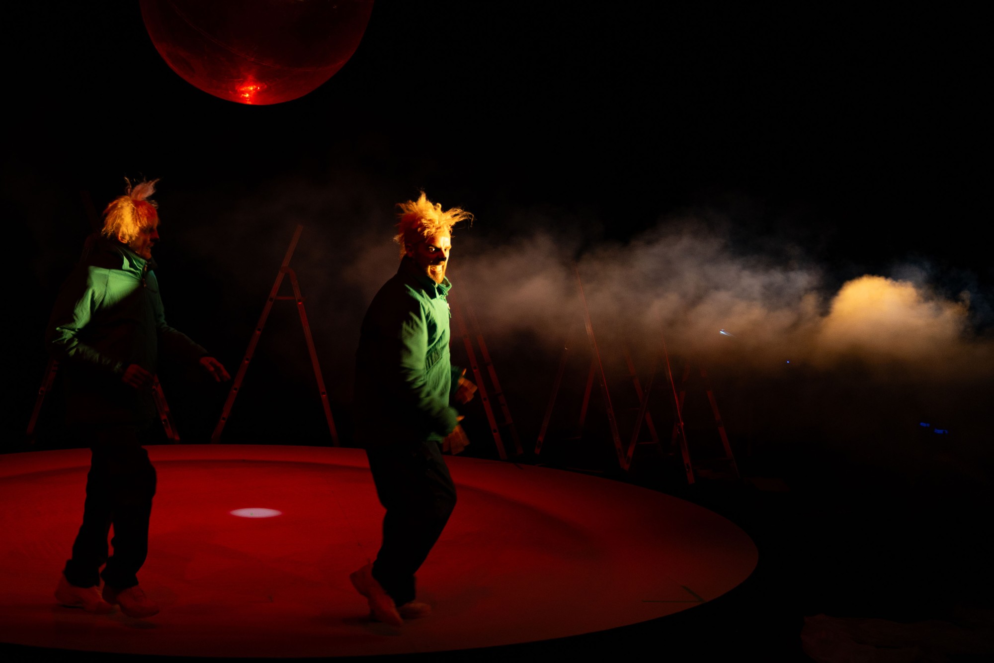 Philippe Gouin et Joan Mompart, véritables compères de la scène, se sont imprégnés de l’essence même de Beckett pour créer un duo clownesque intemporel. Ils sont l’un pour l’autre celui qui est différent, celui qui n’est pas nous. Actapalabra, en laissant « agir les mots », invite poétiquement à retrouver notre humanité. Mille émotions affleurent de leurs gestes. Ils nous mènent avec brio de surprises en surprises, dans un univers où les bananes et les pommes s’envolent, les échelles s’entrecroisent et la terre tombe sur la lune. Leur représentation, minutieusement chorégraphiée, est un mariage entre comédie physique et machinerie théâtrale : effets spéciaux, fumées et apparitions mystérieuses rythment leur performance envoûtante. C’est joyeux, absurde et réjouissant.