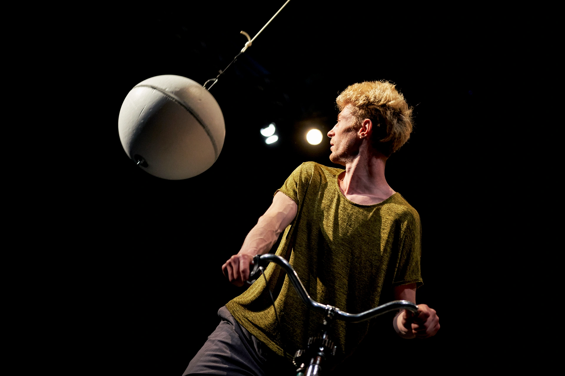 Un homme a vélo regarde derrière lui une grosse boule suspendue à un fil qui le suit Jona Harnish