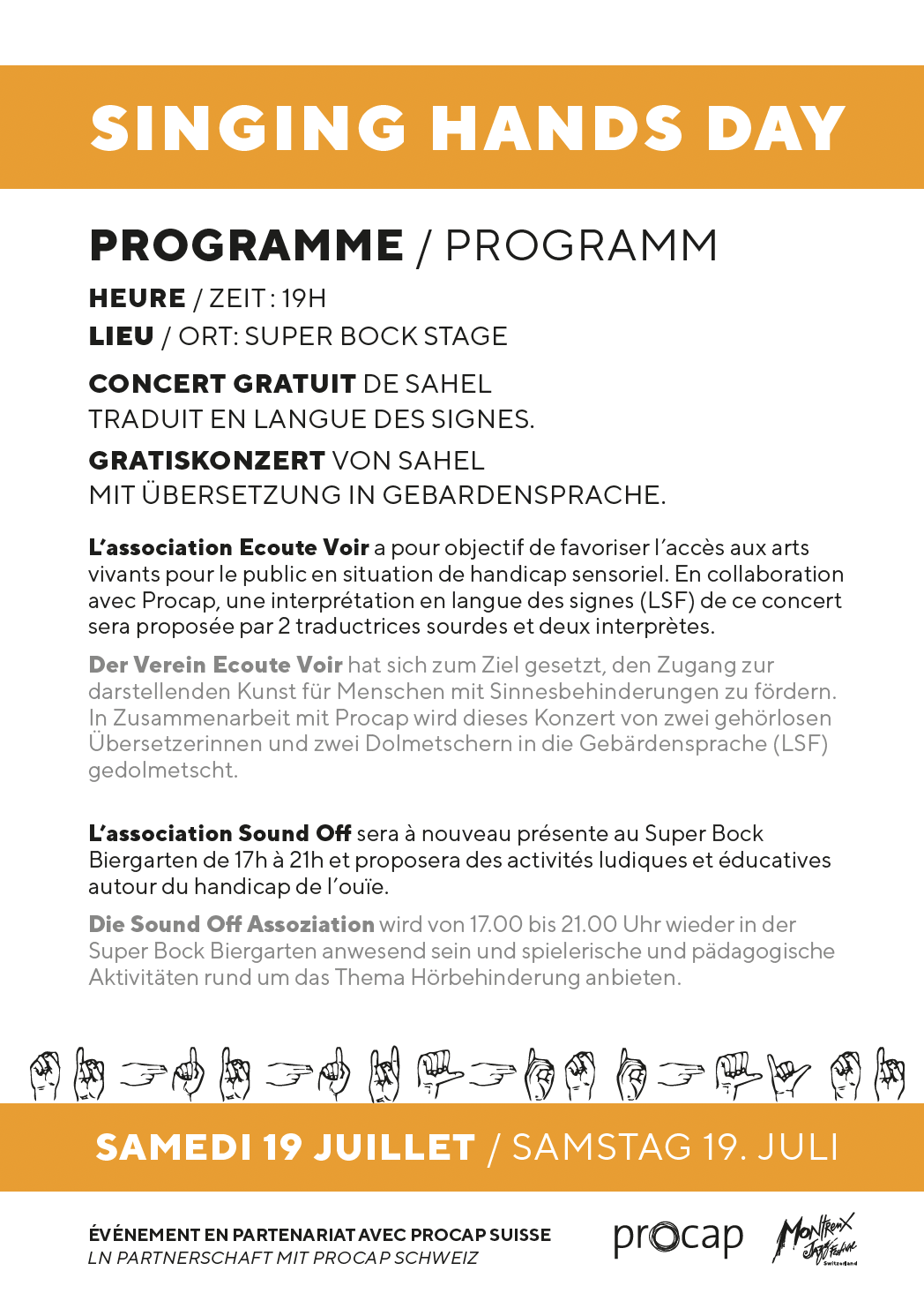 PROCAP, partenaire accessibilité du Montreux Jazz Festival, a le plaisir de proposer en date samedi 19 juillet prochain, dernier samedi du festival, un concert accessible en LSF pour le public sourd pour le traditionnel SINGING HANDS DAY