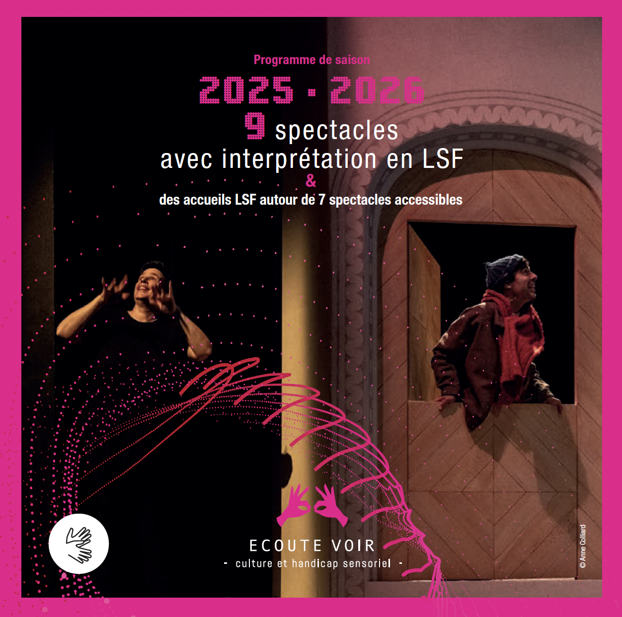 Différents spectacles sont listés ci-dessous. Une majorité d'entre eux sont proposés avec interprétation en langue des signes. Certains spectacles sont 100% visuels et ne nécessitent pas d'interprétation. En collaboration avec les théâtres partenaires, Ecoute Voir propose une traduction en LSF des échanges (bords de scène) entre le public et les comédiens à l'issue du spectacle.